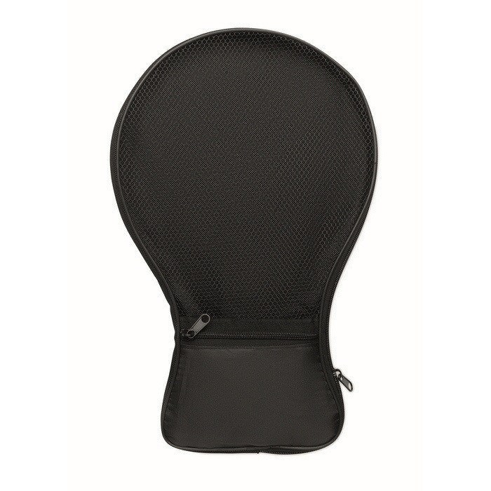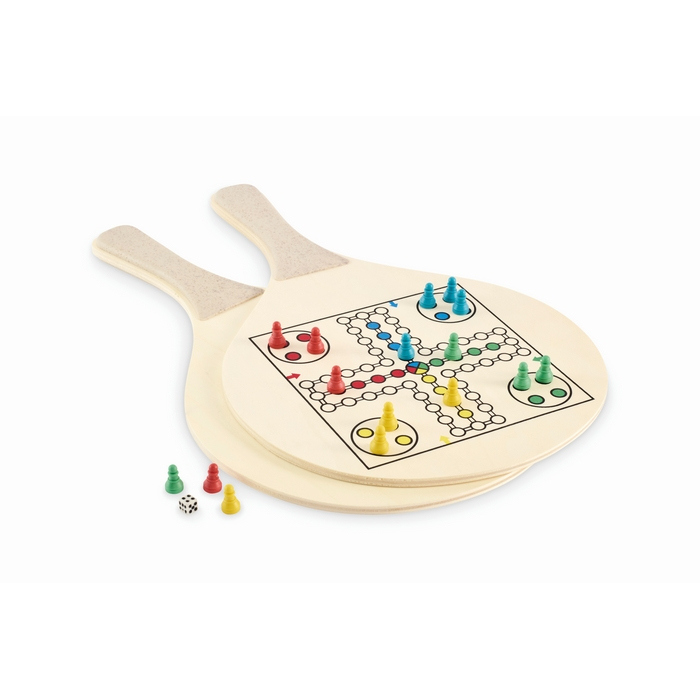 Set aus Strand-Schlägern aus Sperrholz mit integrierten Schach- und Parchis-Spielbrettern. Enthält 1 TPR-Ball sowie Würfel und Spielfiguren, um die Partien zu vervollständigen. Wird in einer RPET-Netztasche mit Reißverschluss geliefert, praktisch zum Verstauen und Transportieren des Sets. Nützliche Lösung für Sommer-Promotionsaktionen oder Firmenveranstaltungen im Freien.