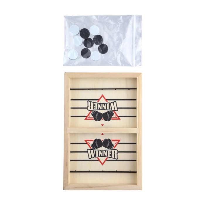 Schnelles Tischhockeyspiel aus Holz mit 10 runden Spielsteinen (5 weiß und 5 schwarz) sowie Anleitung. Stärkt deine Marke und sorgt für Unterhaltung.
