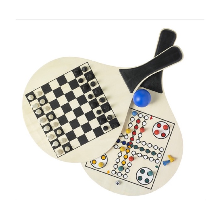 Set mit zwei Strand Schlägern aus Holz und einem Ball, ergänzt durch Gesellschaftsspiele. Geliefert in Nylonhülle – schafft Nähe zu Kunden und Familien.