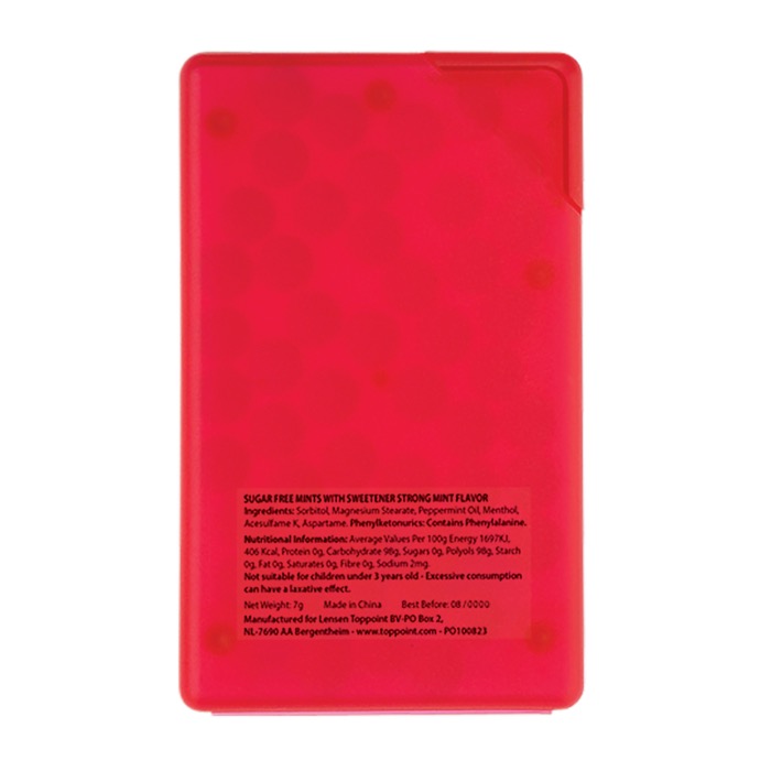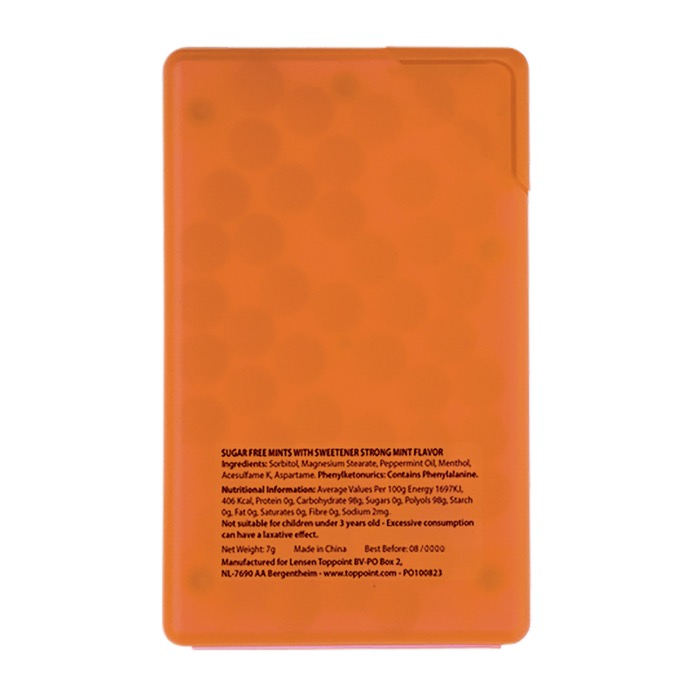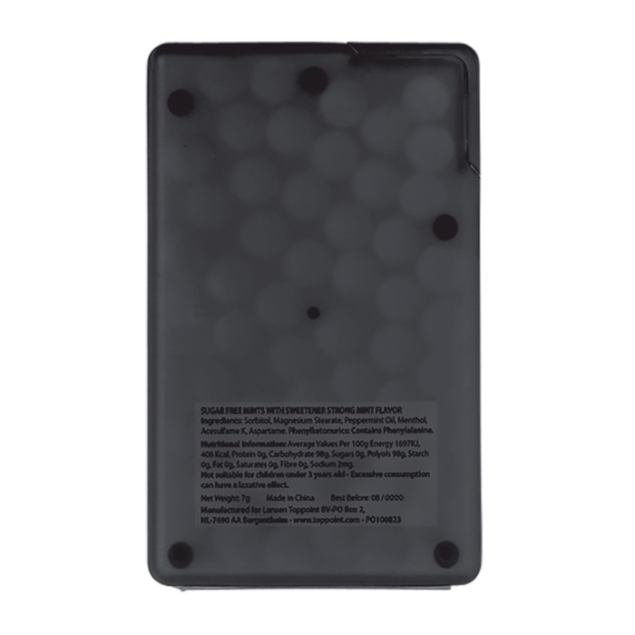 Rechteckiger Pfefferminzspender mit ca. 7g zuckerfreien Pfefferminz.
