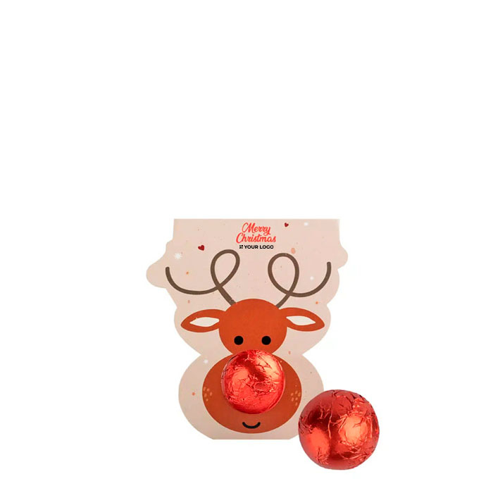 Exquisite Pralinen in Kugelform, verpackt in einer stimmungsvollen Verpackung in Rentierform. Diese köstliche Schokolade, hergestellt aus Cocoa Horizons-zertifiziertem Kakao, garantiert nachhaltige Herkunft. Die Haselnussfüllung ist vollkommen natürlich, ohne künstliche Aromen oder Palmöl. Der Halter, auf dem die Figur steht, besteht aus Grasfaserpapier.