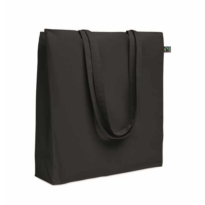 Fairtrade-Einkaufstasche aus Baumwolle mit langen Henkeln und Bodenfalte, konzipiert zum Transport voluminöserer Produkte, ohne beim Tragen über der Schulter an Komfort zu verlieren. Das Gewebe mit 180 g/m² sorgt für eine griffige, stabile Haptik und guten Halt im täglichen Gebrauch. Die Bodenfalte hilft, den Boden stabiler zu halten und den Innenraum besser zu nutzen. Praktische Option für Ausgaben am Point of Sale, Messen, Events und Kampagnen zur Markenpräsenz.