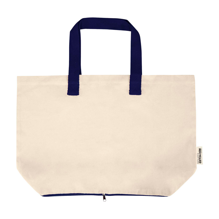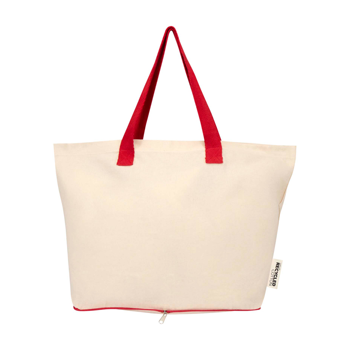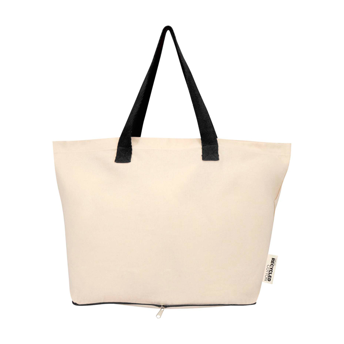 Faltbare Tote Bag aus 100 % recycelter Baumwolle mit GRS-Zertifikat (Global Recycled Standard) mit 140 g/m², für den täglichen Gebrauch konzipiert, mit guter Strapazierfähigkeit und angenehmer Handhabung. Sie lässt sich in ihre eigene Hülle mit Reißverschluss an der Unterseite zusammenfalten und benötigt nur wenig Platz, um sie in Handtasche, Auto oder Koffer mitzunehmen. Sie verfügt über doppelte Tragegriffe für einen sichereren Halt beim Tragen von Gewicht und trägt bis zu 10 kg. Fassungsvermögen: 7 Liter. Empfehlenswert für Markenaktionen auf Messen, für Firmenbeschaffungen oder zur Begrüssung von Mitarbeitenden.