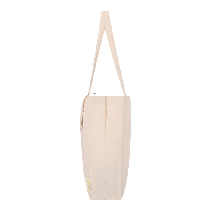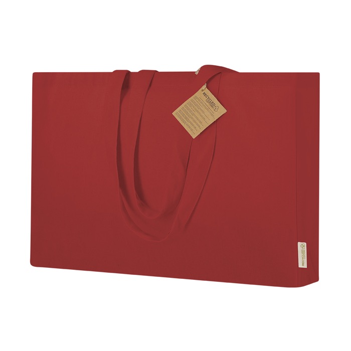 Tasche mit Falte am Boden und an den Seiten, überwiegend aus recycelter Baumwolle mit 220g/m² gefertigt, für den wiederholten Einsatz im Alltag. Sie verfügt über verstärkte lange Henkel in der Größe 70 x 2,5cm, damit Sie sie bequemer und belastbarer über der Schulter tragen können. Ein Kennzeichen für recycelte Baumwolle dient zur Identifizierung des Herstellungsmaterials. Sie trägt bis zu 10kg und eignet sich für Messen, Schulungen oder die Ausgabe von Unternehmensmaterial im Büro.