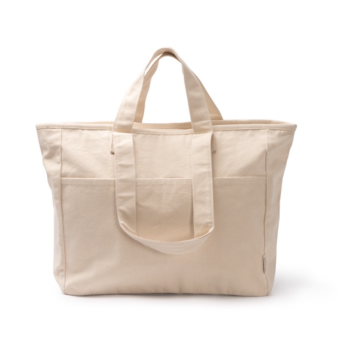 Tasche aus recycelter Baumwolle mit 420 g/m² und einer Konstruktion für den täglichen Einsatz in Unternehmen. Sie verfügt über verstärkte Doppelgriffe in zwei Längen, sodass Sie sie über der Schulter oder in der Hand tragen können. Der Zwickel am Boden und an den Seiten sorgt für mehr Volumen und eine flexiblere Form, wenn sie voll ist. Zwei Fronttaschen helfen beim Organisieren von Zubehör, und der Reißverschluss am Hauptfach ist praktisch für unterwegs. Eine praktische Option für Veranstaltungen, Markenaktionen oder die interne Nutzung im Büro.