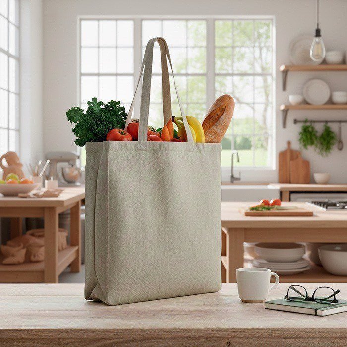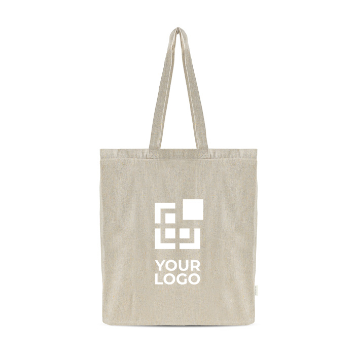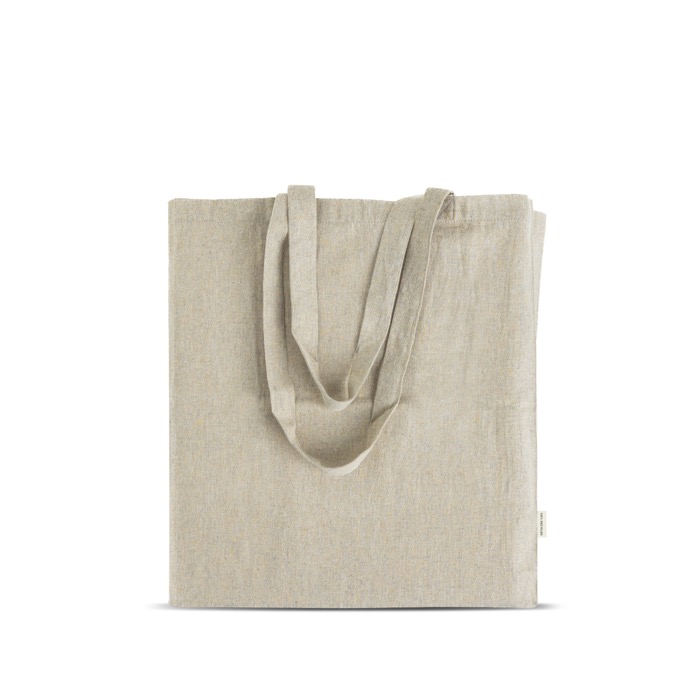 Tasche aus recycelter Baumwolle in Mélange Optik in hellem Naturton, ideal für den häufigen Einsatz. Mit rundum Falte für mehr Volumen und den stabilen Transport auch von grösseren Gegenständen. Das Material besteht aus wiederverwendeten Stoffresten und sorgt für eine robuste Verarbeitung sowie ein gleichmässiges Erscheinungsbild. Die langen Henkel ermöglichen ein bequemes Tragen über der Schulter, sowohl im Innen als auch im Aussenbereich. Eine praktische Lösung für Markenaktionen auf Messen, im Handel oder bei internen Kampagnen.