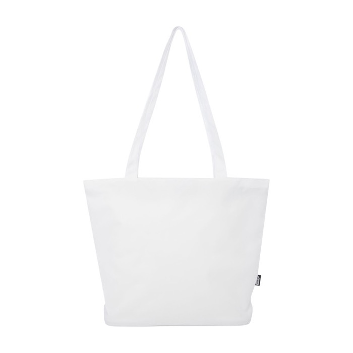 Die Panama GRS-recycelte Tragetasche mit Reißverschluss aus wasserabweisendem 600D RPET ist eine perfekte und nachhaltige Mehrzwecktasche für den Besuch einer Veranstaltung, für den Strand oder für den Lebensmitteleinkauf. Sie verfügt über ein Hauptfach mit Reißverschluss und eine Innentasche mit Reißverschluss, die groß genug ist, um Ihr Telefon und andere wertvolle Gegenstände zu verstauen. Die Griffe sind 34 cm lang, sodass die Tasche leicht über der Schulter getragen werden kann. Belastbarkeit bis zu 10 kg. PVC frei.