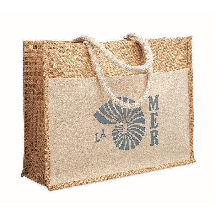 Einkaufs- oder Strandtasche aus laminiertem Jute und Baumwoll-Canvas mit 280 g/m², konzipiert für den täglichen und wiederholten Gebrauch. Sie kombiniert einen robusten Korpus mit Kordelgriffen für einen bequemen Halt in der Hand oder über der Schulter. Sie verfügt über eine große offene Fronttasche, praktisch zum Verstauen von Dokumenten, Broschüren oder kleinen Gegenständen, die man griffbereit haben möchte. Aufgrund ihrer Größe und Verarbeitung eignet sie sich für Messen, Willkommenspakete oder Merchandising-Aktionen am Point of Sale.