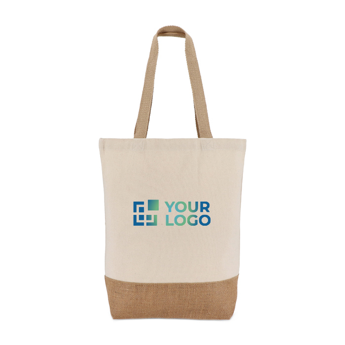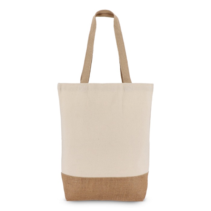 Baumwolltasche mit robuster Jutebasis, stilvoll und langlebig. Vereint Nachhaltigkeit mit Eleganz. Zieht bei Events zuverlässig Aufmerksamkeit auf sich.