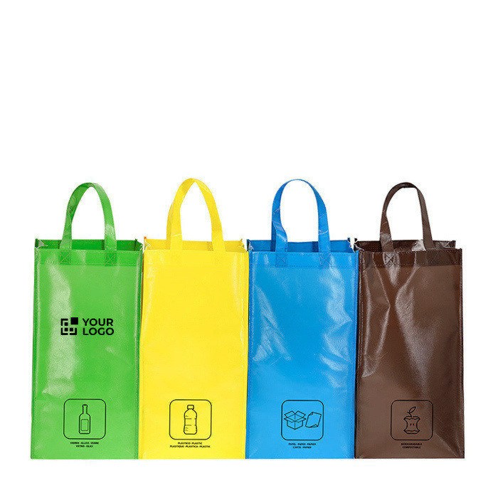 Set mit 4 Recyclingbeuteln aus laminiertem Vliesstoff (125 g/m²) mit glänzender, strapazierfähiger Oberfläche, konzipiert für die geordnete Abfalltrennung im Büro oder Lager. Enthalten sind drei Beutel im Format 23x45x23 cm, die seitlich mit robusten Klettverschlüssen miteinander verbunden sind, plus eine vierte Einheit zur Vervollständigung der Sortierung. Verstärkte Tragegriffe erleichtern den Transport und den täglichen Einsatz. Jeder Beutel ist mit der Abfallart gekennzeichnet: Kunststoff und Verpackungen, Bioabfall, Glas und Papier. Eine praktische Option für interne Kampagnen und Unternehmensveranstaltungen.