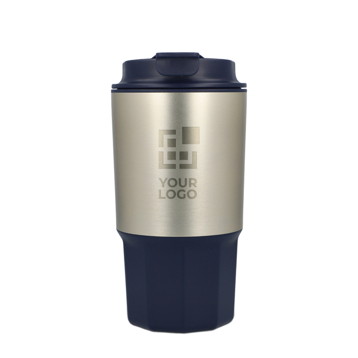 Kaffee To Go Becher aus Edelstahl mit Silikonband mit Logo, 350 ml