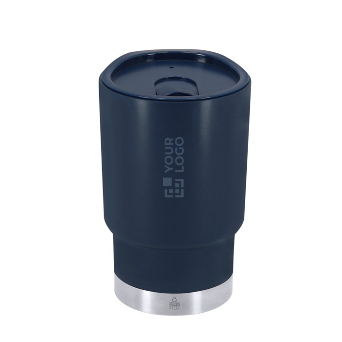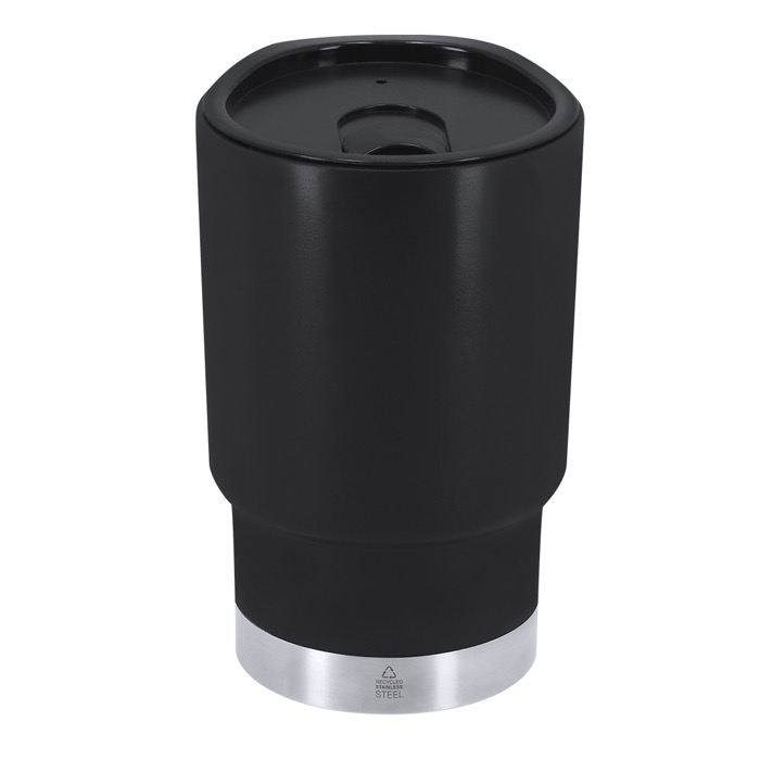Thermobecher mit 380 ml Fassungsvermögen, hergestellt aus robustem, recyceltem PP mit doppelter Wand und Boden aus recyceltem Edelstahl. Mit leicht zu öffnendem Dosierdeckel, BPA-frei. Ideal für den Schreibtisch oder unterwegs. Lebensmittelecht (Food Grade-zertifiziert).