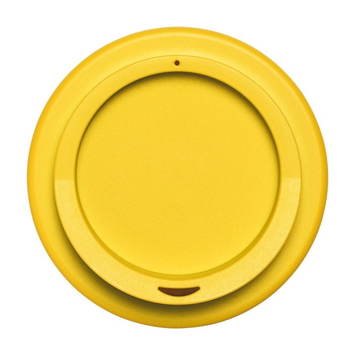 Becher mit sicherem Schraubdeckel aus Kunststoff und Silikongriff für späteres Recycling. Lassen Sie diesen für Ihre Mitarbeiter mit Ihrem Logo bedrucken.