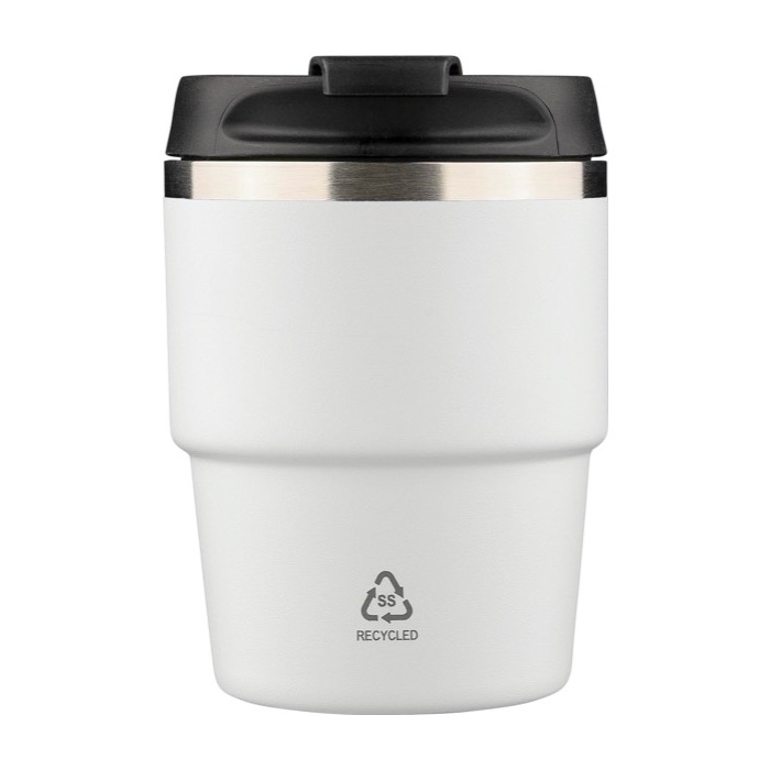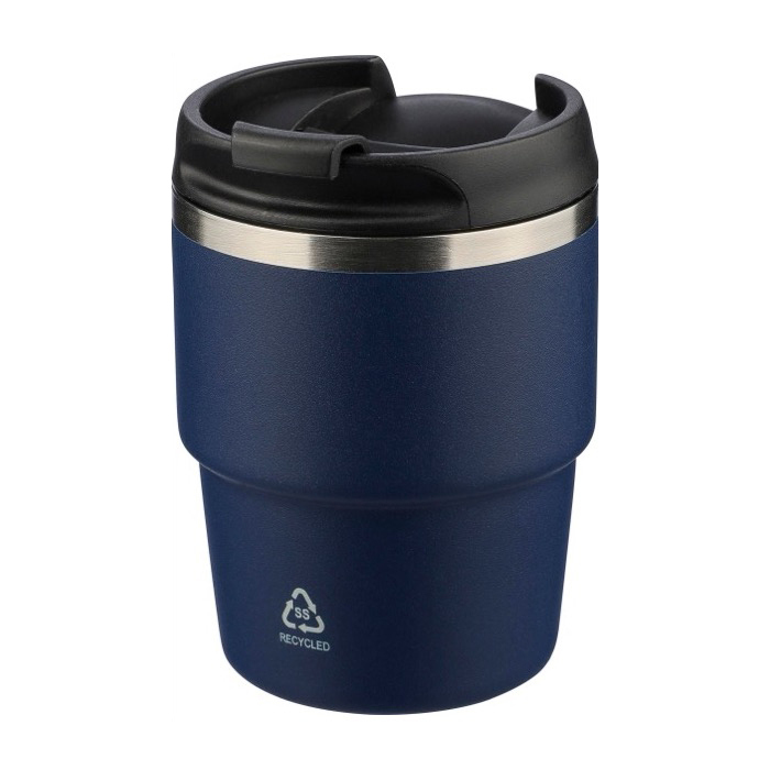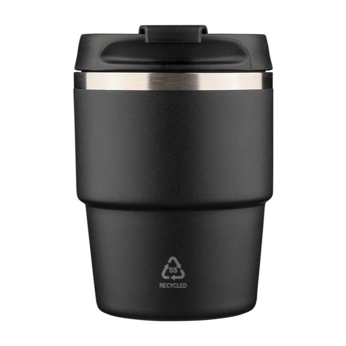 Becher aus recyceltem Edelstahl mit doppelwandiger Vakuumisolierung und Kunststoffdeckel mit Schraubverschluss für ein sicheres Verschliessen. Der Innenbehälter aus Edelstahl 304 hilft, das Getränk länger auf der richtigen Temperatur zu halten, während die Aussenseite aus Edelstahl 201 mit einer Pulverbeschichtung für einen festeren Griff versehen ist. Kompaktes Format, das so konzipiert ist, dass es in die meisten Kaffeemaschinen passt. Enthält ein per Laser in den Edelstahl graviertes Logo auf der Vorderseite und wird in einer einzelnen braunen Kartonschachtel geliefert, ideal für Unternehmensaktionen.