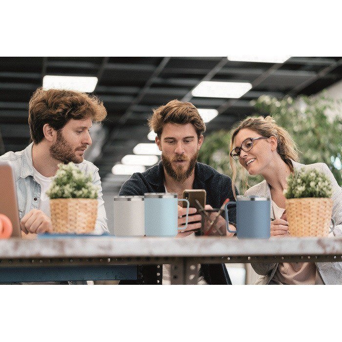 Doppelwandiger Edelstahlbecher, der Getränke zuverlässig auf Temperatur hält und dank Schiebedeckel Spritzer reduziert, ideal für Corporate-Umgebungen.
