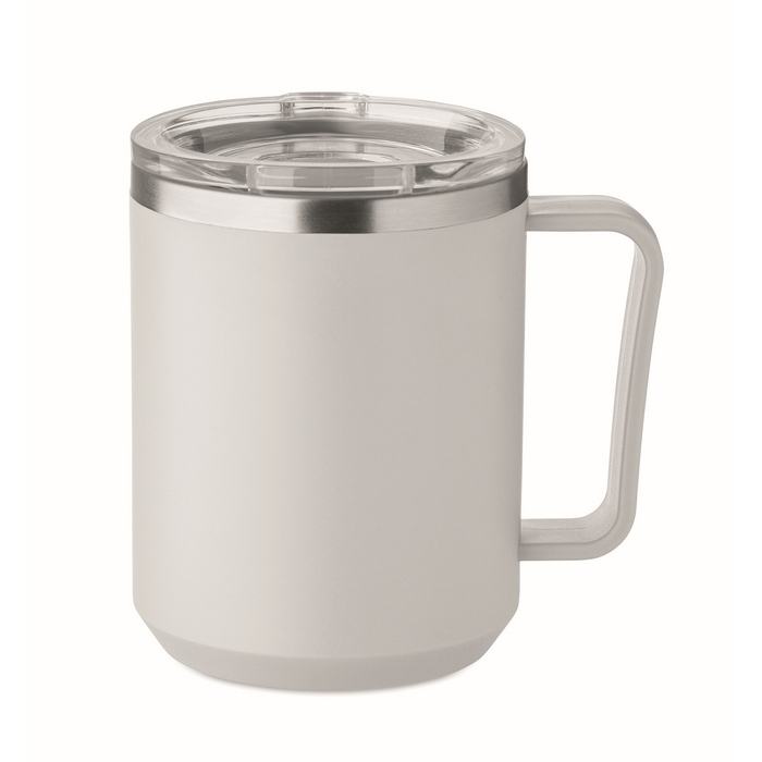 Doppelwandbecher mit Innenwand aus 90% recyceltem Edelstahl und 10% Edelstahl sowie Außenwand aus recyceltem PP. Inklusive transparentem AS-Schiebedeckel für bequemes Trinken und weniger Spritzer im Alltag. Fassungsvermögen 400 ml, geeignet für Kaffee, Tee oder kalte Getränke im Büro und unterwegs. Praktische Option zur Ausstattung von Besprechungsräumen, Willkommenspaketen oder Markenaktionen bei Firmenevents.