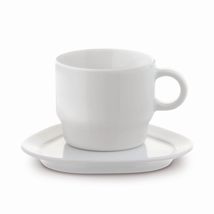 Porzellantasse und -untertasse aus hochwertiger europäischer Produktion. Lassen Sie diese Tasse bedrucken und stärken Ihre Unternehmensidentität.