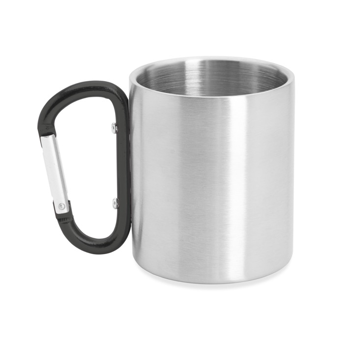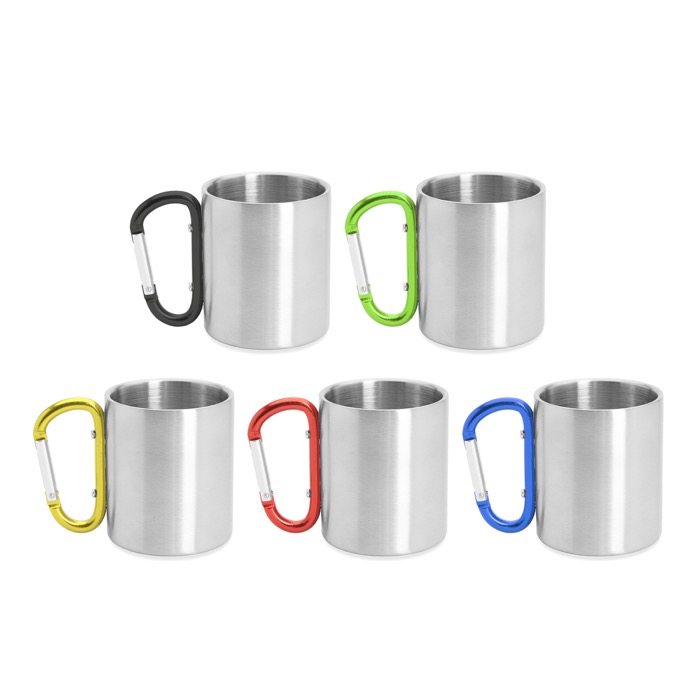 Doppelwandige Metalltasse mit Karabinergriff, ideal zum Tragen. Erhältlich in verschiedenen Farben. Mit einem Fassungsvermögen von 230 ml.