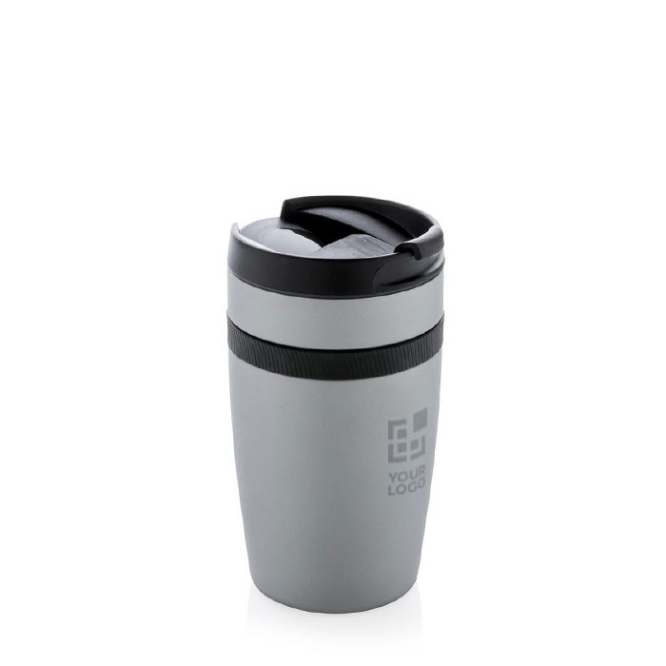 Kleiner doppelwandiger Isolierbecher mit Silikondetail. Ein vielseitiges Werbegeschenk, das Sie in Ihrem Team als Teil des Willkommenspakets überreichen können.