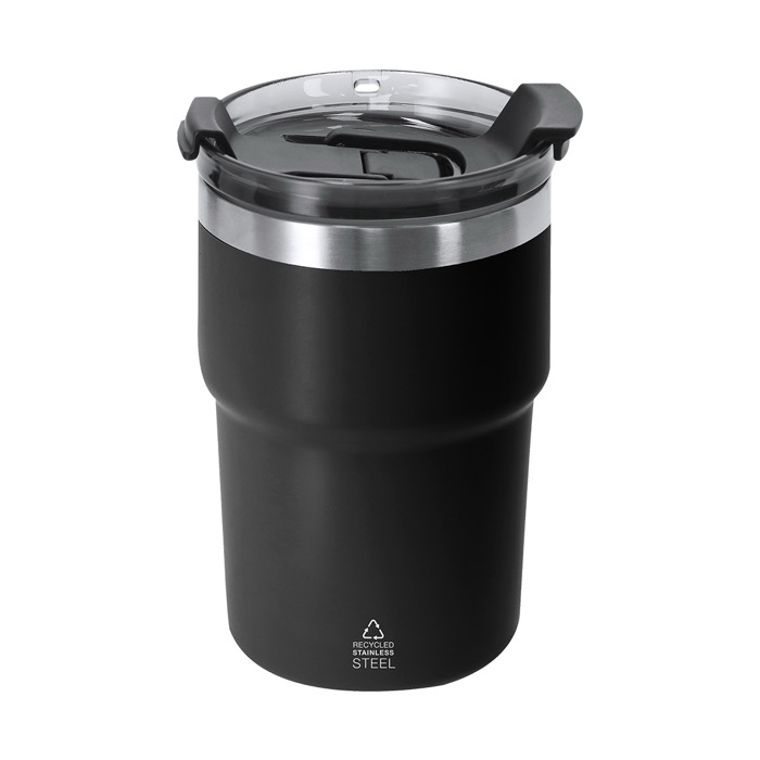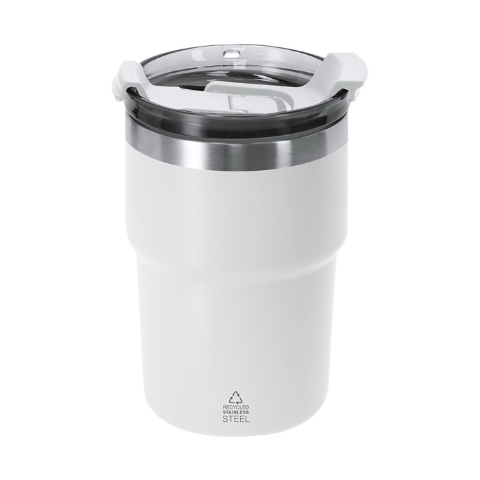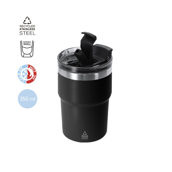 Thermobecher aus recyceltem Edelstahl mit seidenmatter Oberfläche und 350 ml Fassungsvermögen, konzipiert für den täglichen Einsatz im Büro oder unterwegs. Die Doppelwand hilft, die Getränketemperatur länger zu halten und reduziert Kondenswasser Außen. Der Deckel verfügt über ein dicht Schließendes Dichtsystem, um Auslaufen zu vermeiden. Er bietet ein doppeltes Trinksystem, das je nach Situation gewechselt werden kann. BPA-freies Material (Bisphenol A). Eine praktische Option für Markenmaßnahmen bei Unternehmensveranstaltungen und für interne Teams.