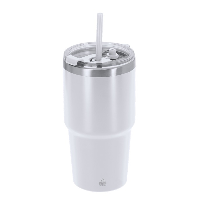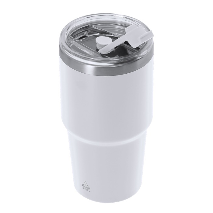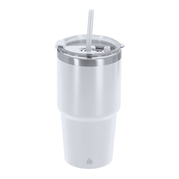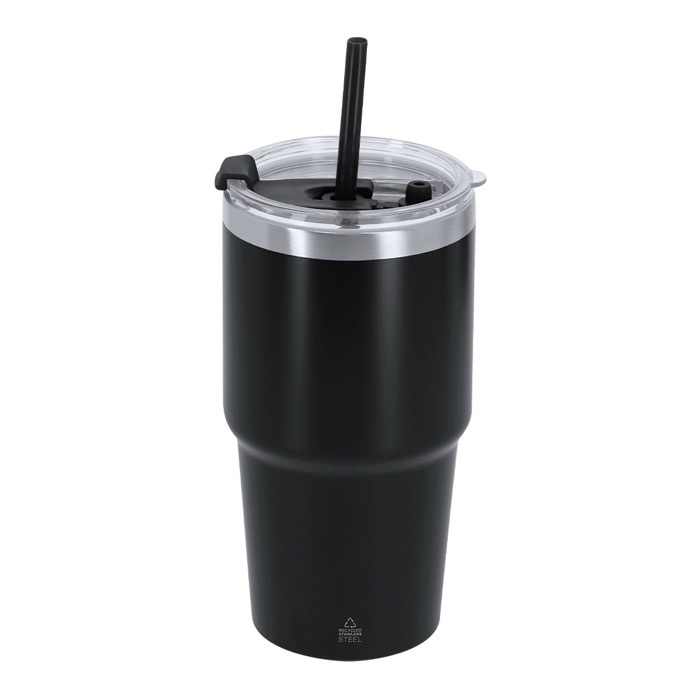 Thermobecher aus recyceltem Edelstahl mit Doppelwand und einem Fassungsvermögen von 650 ml, konzipiert für den täglichen Einsatz im Büro oder bei Besprechungen. Er verfügt über ein doppeltes Trinksystem, das sich an unterschiedliche Vorlieben anpasst: Trinköffnung mit auslaufsicherem Verschluss und integriertem Strohhalm. Wenn der Strohhalm entfernt wird, ist ein zusätzlicher Verschlussstopfen enthalten, um die Dichtheit zu erhalten und Auslaufen zu verhindern. Hält Getränke bis zu 3 Stunden warm und bis zu 6 Stunden kalt. Praktische Option für Unternehmens-Merchandising und Willkommensgeschenke am Arbeitsplatz.