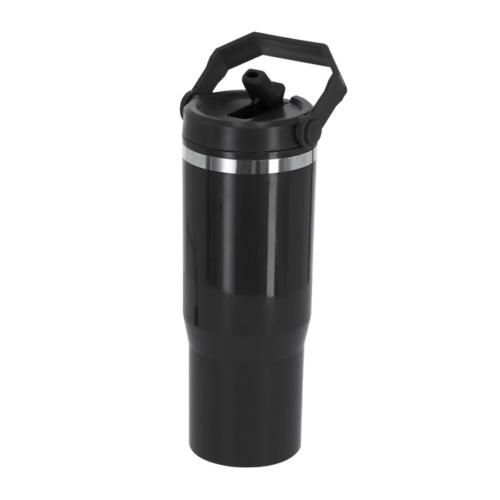 Thermobecher aus Kunststoff mit Doppelwand und 900 ml Fassungsvermögen, entwickelt für den täglichen Einsatz im Büro und unterwegs. Er verfügt über einen Strohhalm für komfortables Trinken sowie einen Deckel mit luftdichtem Verschlusssystem, der hilft, Verschütten zu vermeiden. Ein Tragegriff erleichtert den Transport. Er hält Wärme bis zu 2 Stunden und Kälte bis zu 4 Stunden, je nach Nutzungsbedingungen. BPA-frei und mit Food-Grade-Zertifizierung für den Kontakt mit Lebensmitteln. Eine praktische Lösung für interne Maßnahmen, Veranstaltungen und Unternehmensgeschenke mit Logo.