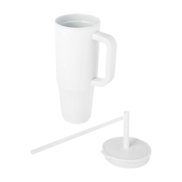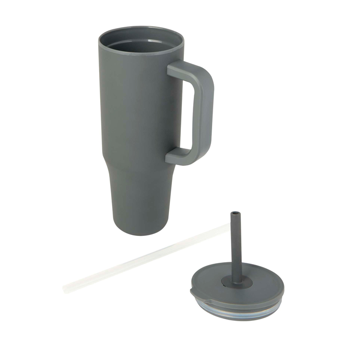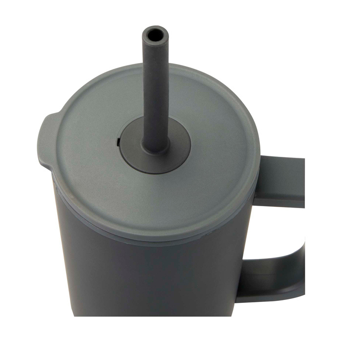 Becher mit Außenwand aus recyceltem, RCS-zertifiziertem Edelstahl und Innenwand aus Kunststoff. Inklusive integriertem Trinkhalm aus lebensmittelechtem Silikon und spritzwassergeschütztem Druckdeckel für komfortables Trinken. Auch für Heißgetränke geeignet, jedoch nicht zur Verwendung mit dem Trinkhalm empfohlen. Fassungsvermögen: 900 ml. Nur Handwäsche.