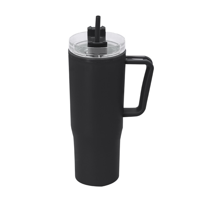 Doppelwandiger Thermobecher aus recyceltem Kunststoff mit einem Fassungsvermögen von 900 ml für den täglichen Einsatz im Büro oder bei Veranstaltungen. Er verfügt über einen transluzenten Deckel mit Druckverschluss, eine Trinköffnung und eine Schiebeabdeckung zur Nutzung mit Trinkhalm. Der ergonomische Tragegriff verbessert den Halt bei kurzen Wegen. Hält Getränke bis zu 3 Stunden warm und bis zu 6 Stunden kalt und ist BPA-frei (Bisphenol A). Eine praktische Option, die Sie für internes Marketing mit Ihrem Logo personalisieren können.