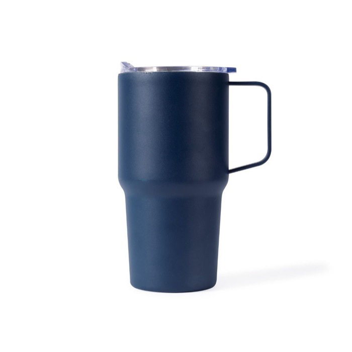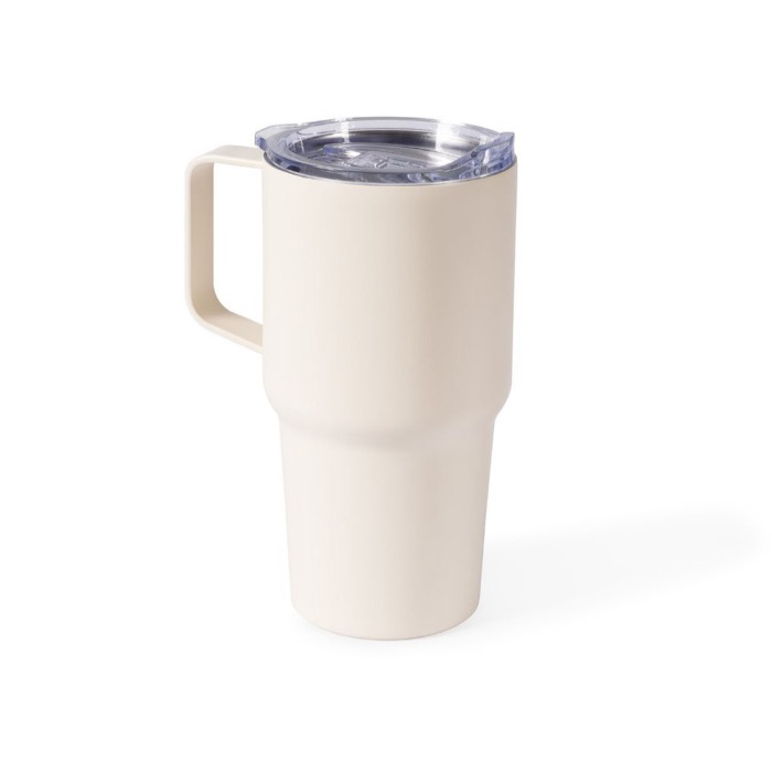 Doppelwandiger Thermobecher aus recyceltem Edelstahl mit integriertem Griff und 600 ml Fassungsvermögen. Die Isolierfunktion hält die Temperatur: warm bis zu 10 Stunden und kalt bis zu 10 Stunden – ideal, um den Tag im Büro oder unterwegs zu organisieren. Der auslaufsichere Verschluss reduziert das Auslaufen in Taschen und Rucksäcken während der Wege. Nicht empfohlen für kohlensäurehaltige oder saure Getränke. Eine praktische Option, um Teams, Teilnehmende an Veranstaltungen oder Markenaktionen mit Ihrem Logo auszustatten.