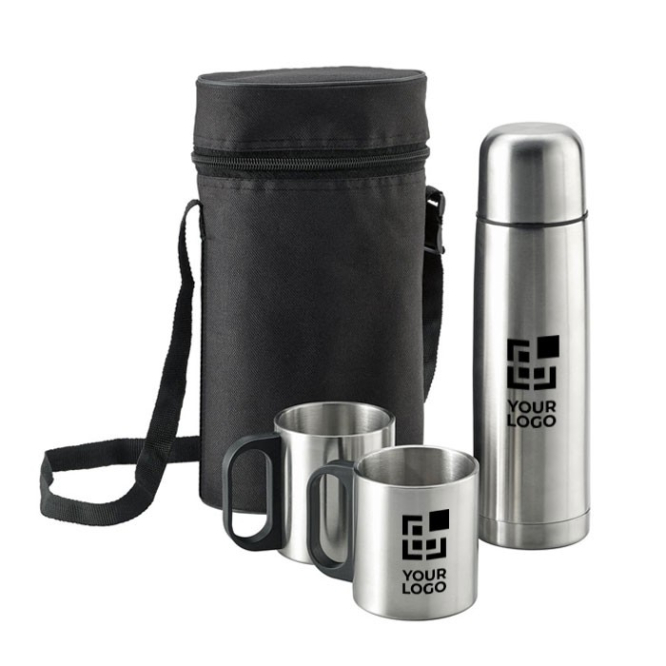 Set bestehend aus Isolierkanne (500 ml) und Tassen aus Edelstahl. Doppelwandige Isolierkanne mit 2 Tassen (je 200 ml) und einer Tasche aus 600D mit verstellbarem Tragegurt.