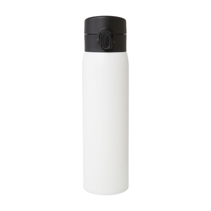Elegante, RCS-zertifizierte Isolierflasche aus recyceltem Edelstahl mit einfachem Öffnungsmechanismus per Knopfdruck. Die Flasche ist auslaufsicher, und dank der Kupfer-Vakuumisolierung bleiben die Getränke mehrere Stunden lang heiß oder kalt. Das Fassungsvermögen beträgt 450 ml. Verpackt in einer Geschenkbox aus Recyclingkarton.