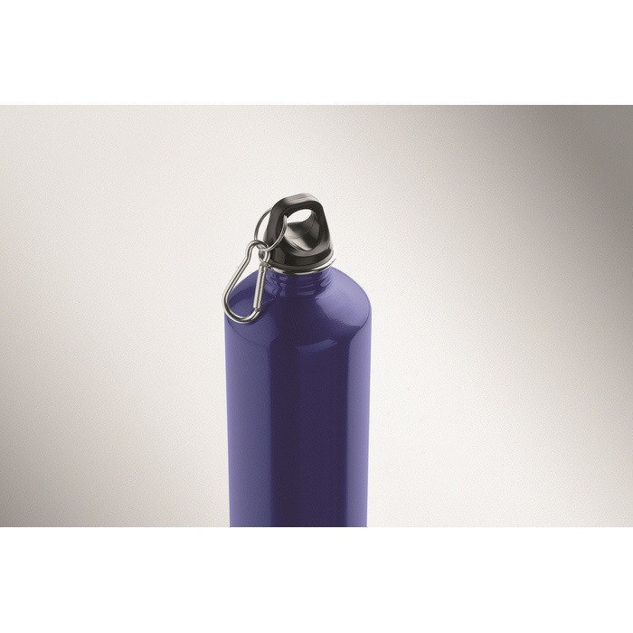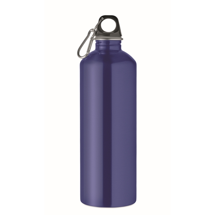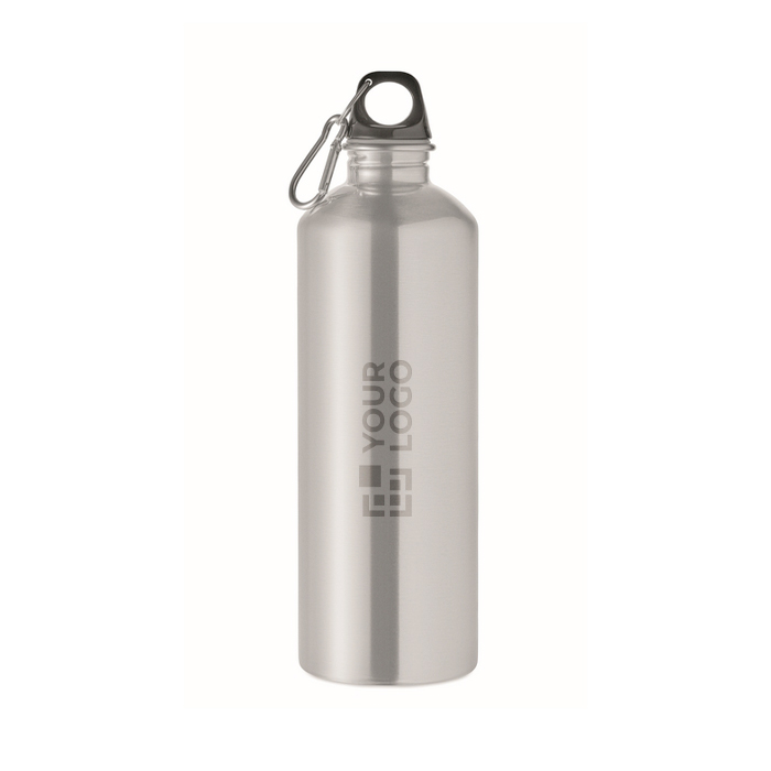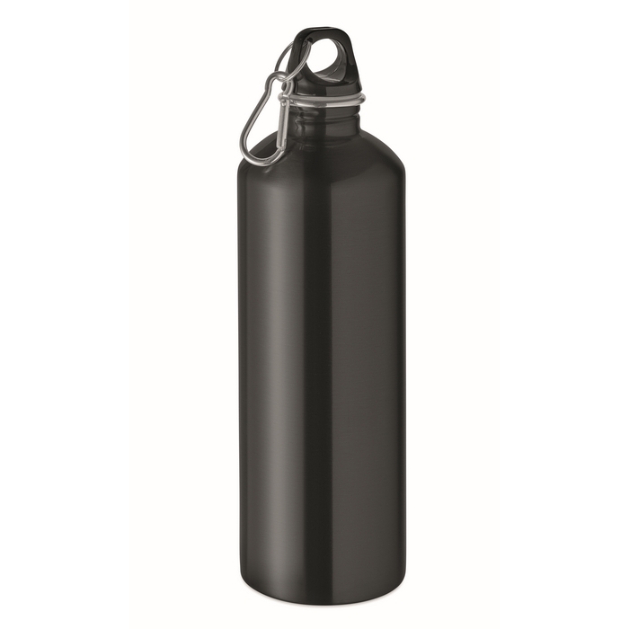 Einwandige Flasche aus Edelstahl (90 % recycelt und 10 % Edelstahl), konzipiert für den täglichen Einsatz im Büro oder unterwegs. Sie verfügt über einen PP-Deckel mit Karabiner, um sie an einem Rucksack, einer Tasche oder einem Lagerhaken aufzuhängen. Das Fassungsvermögen von 1000 ml hilft, Nachfüllvorgänge während des Tages zu reduzieren. Da sie einwandig ist, kann es bei kalten oder heißen Getränken zu Wärmeübertragung kommen. Praktische Option für Willkommenssets oder Firmenevents.