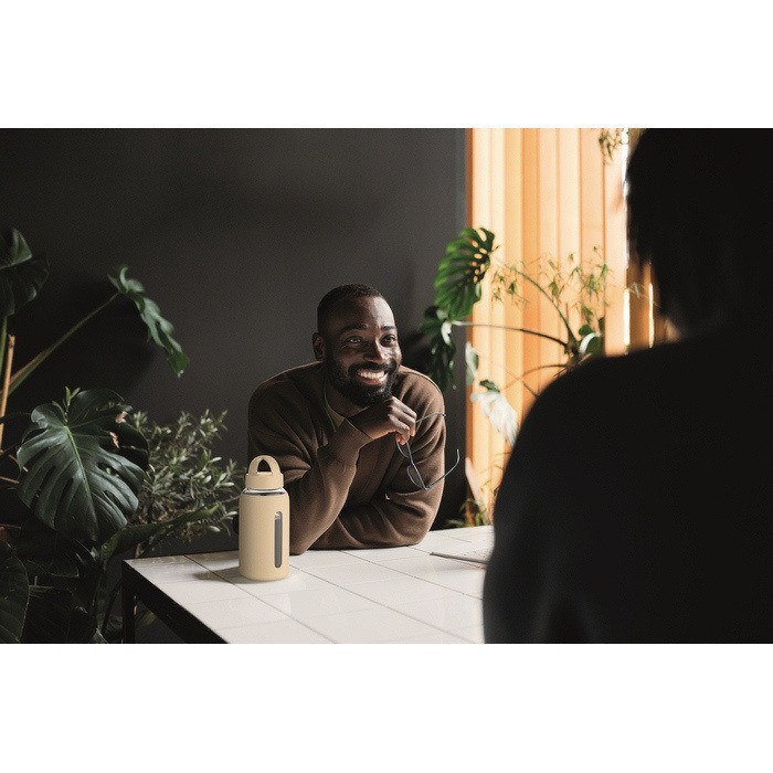 Borosilikatglasflasche mit einem Fassungsvermögen von 600 ml, konzipiert für den täglichen Gebrauch im Büro oder unterwegs. Sie verfügt über eine Silikonhülle, die den Griff verbessert und hilft, die Oberfläche vor leichten Stößen zu schützen. Der Deckel besteht aus PP und hat eine Schlaufe zum bequemen Tragen oder um sie einfach an einem Rucksack aufzuhängen. Praktisches Format für Wasser, Aufgüsse oder kalte Getränke. Nützliche Option für Willkommenspakete oder interne Aktionen.