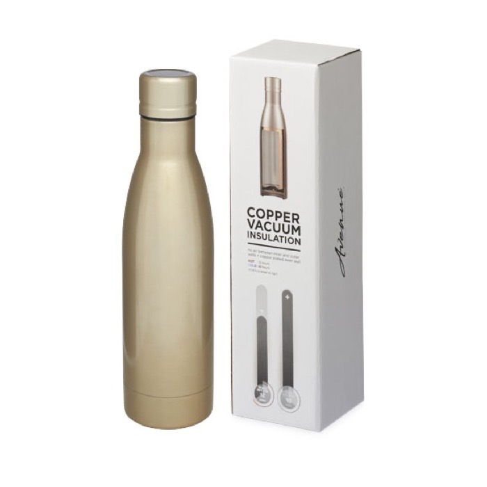Diese Edelstahlflasche mit vakuumisolierter, doppelwandiger Kupferbeschichtung (18/8) ermöglicht es, die Innentemperatur des enthaltenen Getränks zu halten. In Bezug auf diese Spezifikation kann sie Getränke 48 Stunden lang kalt oder 12 Stunden lang heiß halten – je nach Bedarf und Verwendungszweck. Das Volumen von 500 ml ist ein übliches Format für diese Behälter. Aufgrund ihrer Leistungen und der Tatsache, dass sie in einer Avenue-Box präsentiert wird, stellt diese Metallflasche ein Geschenk mit hohem wahrgenommenem Wert dar.