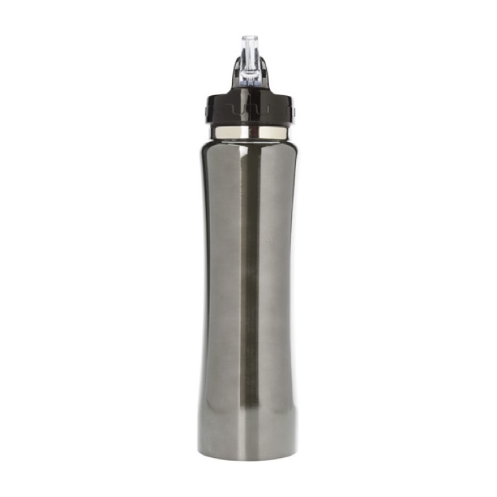 Sportliche Geschenke sollten langlebig und praktisch sein, wie diese Edelstahl-Trinkflasche mit Schraubverschluss und Ausgießer.