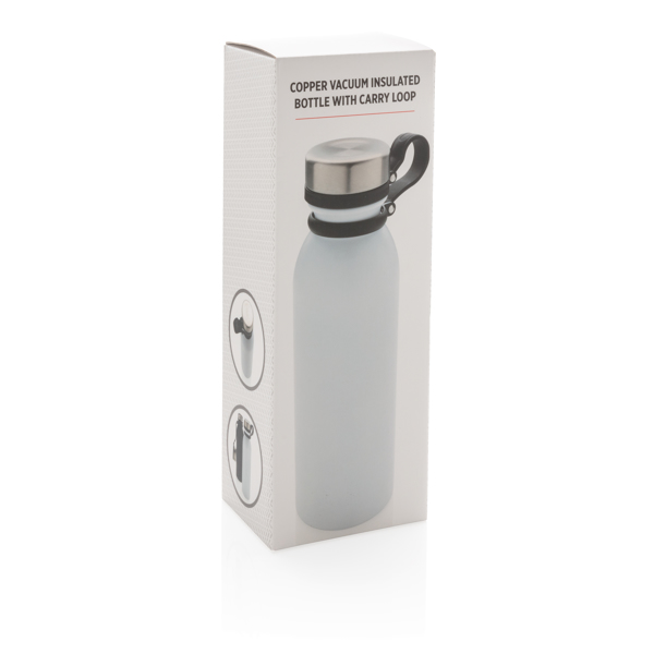 Diese doppelwandige Kupfer-Vakuumisolierte Trinkflasche hält Ihre Getränke bis zu 8h warm und bis zu 24h kalt. Der schwarze Trageriemen aus Silikon ist ebenso am Deckel befestigt und muss somit beim Trinken nicht noch separat festgehalten werden. Die weiß-graue ist PMS Cool Gray 1. Inhalt: 600ml. Nur Handwäsche.