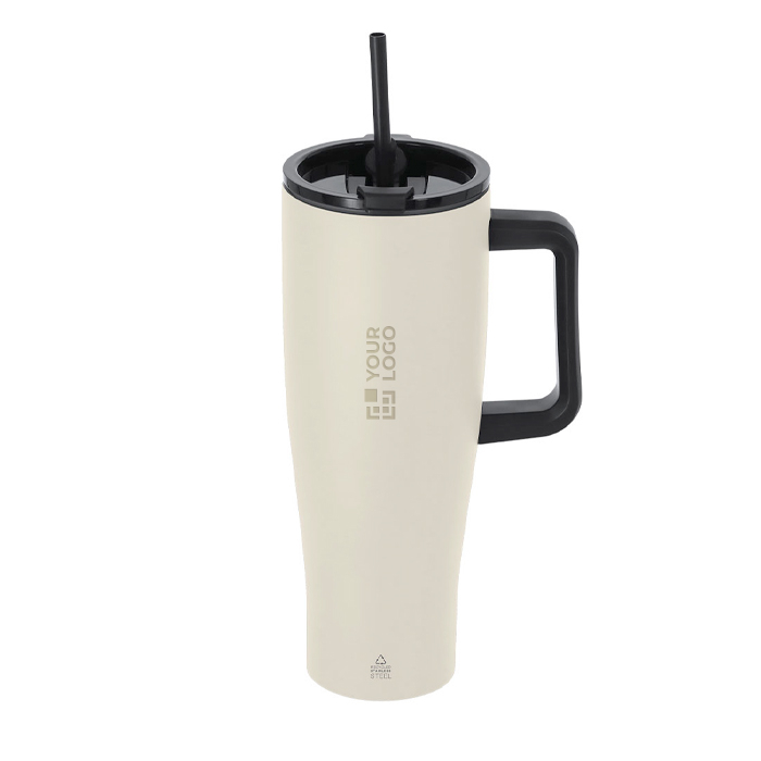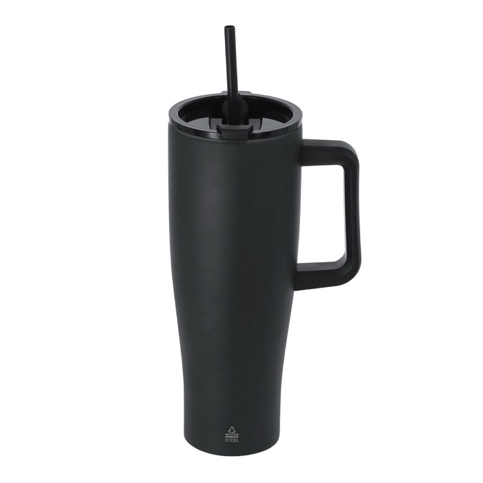 Thermobecher aus recyceltem Edelstahl mit einem Fassungsvermögen von 1200 ml, gedacht für die komfortable Nutzung im Büro, bei Veranstaltungen und unterwegs. Er verfügt über ein doppeltes Trinksystem: eine Öffnung mit hermetischem Verschluss zum kontrollierten Ausgiessen sowie einen Strohhalm zum direkten Trinken. Der ergonomische Tragegriff aus Kunststoff verbessert den Halt und erleichtert den Transport von einem Ort zum anderen. BPA-freies Material (Bisphenol A) und mit Kennzeichnung für recycelten Edelstahl. Nützlich als Unternehmensgeschenk für Markenmaßnahmen in internen Umgebungen.