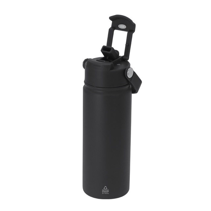 Thermobecher aus recyceltem Edelstahl mit 550ml Fassungsvermögen, konzipiert für den täglichen Einsatz im Büro, auf Reisen oder bei Veranstaltungen. Er bietet ein doppeltes Trinksystem: Sie wählen je nach Situation zwischen einer Öffnung mit dichtem Verschluss oder einem integrierten Strohhalm. Der Deckel mit Dichtung hilft, Auslaufen zu vermeiden, und der Tragegriff erleichtert den Transport von einem Ort zum anderen. BPA-frei (Bisphenol A). Hält Getränke bis zu 6h warm und bis zu 15h kalt – ideal für Unternehmens-Werbeaktionen.