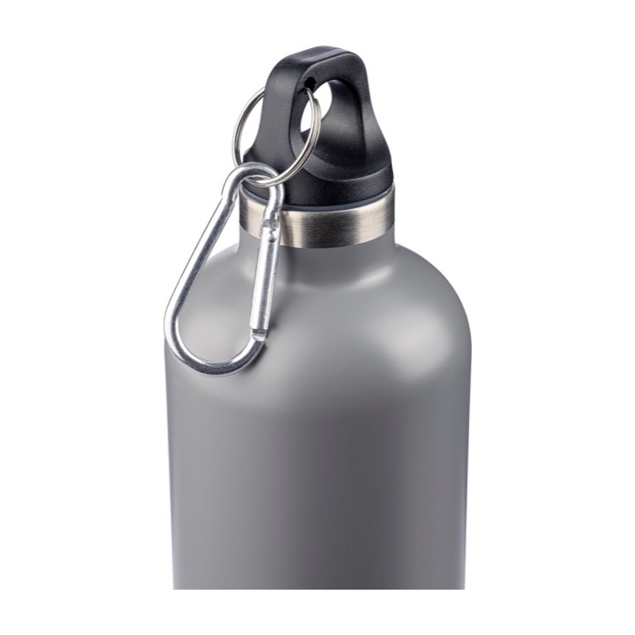 Isolierflasche aus recyceltem Edelstahl (500 ml) mit Doppelwand, PP-Deckel und Aluminiumkarabiner. Hält Getränke 8 Stunden warm und 12 Stunden kalt. Mattes Finish (außer silber), mit Recyclinglogo. Nicht spülmaschinengeeignet, nicht für kohlensäurehaltige oder saure Getränke. Geliefert in brauner Kartonbox