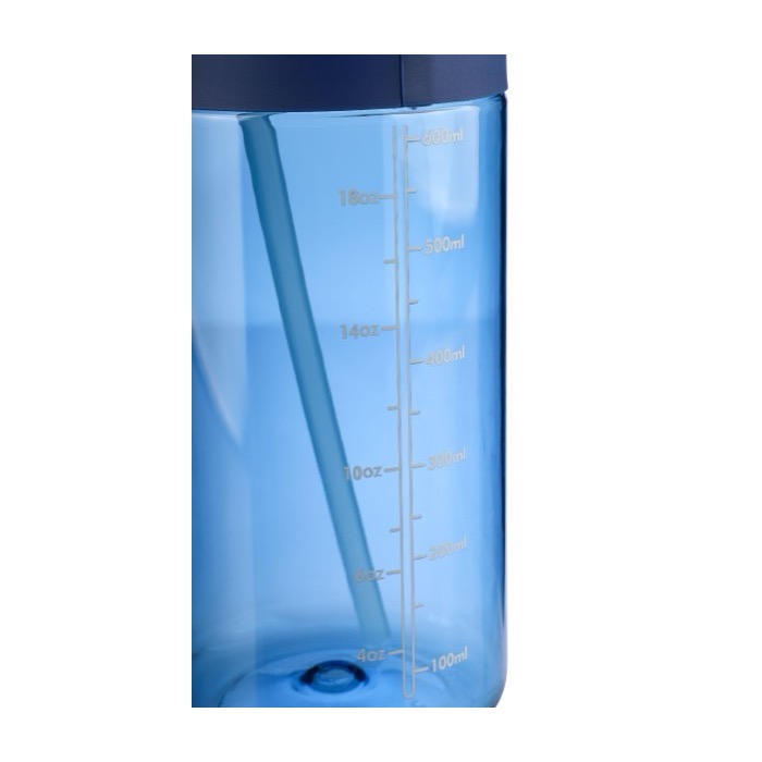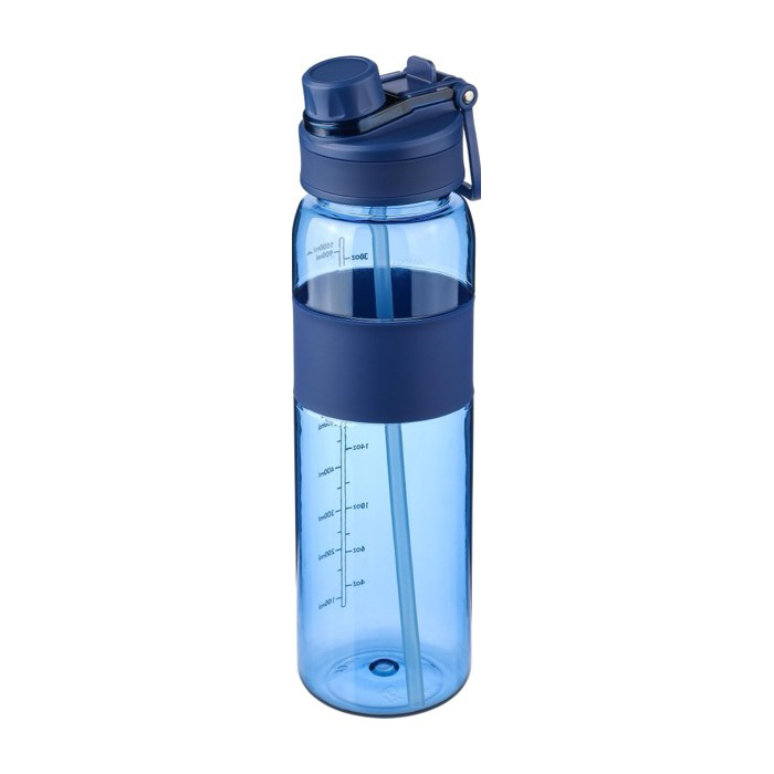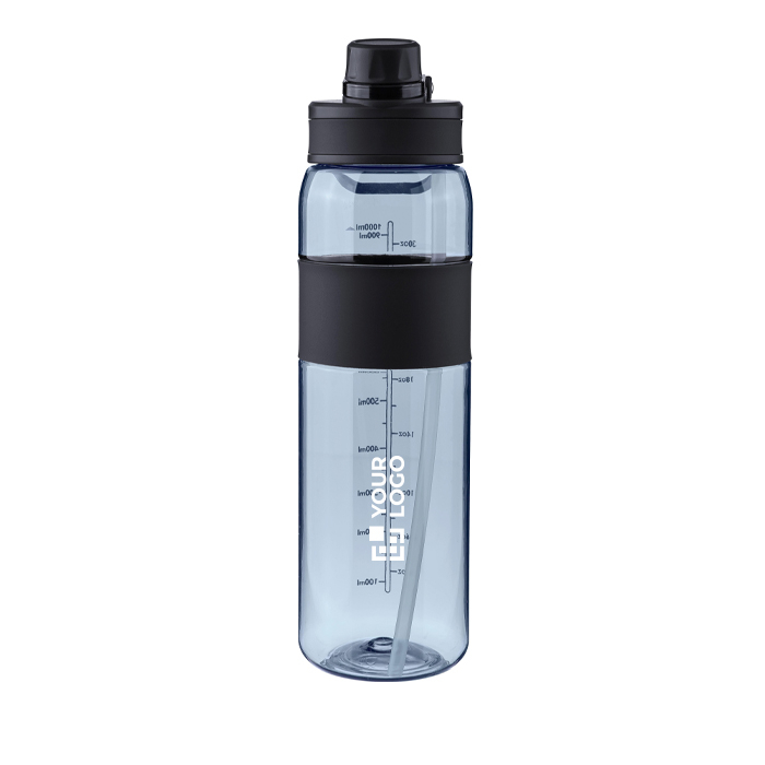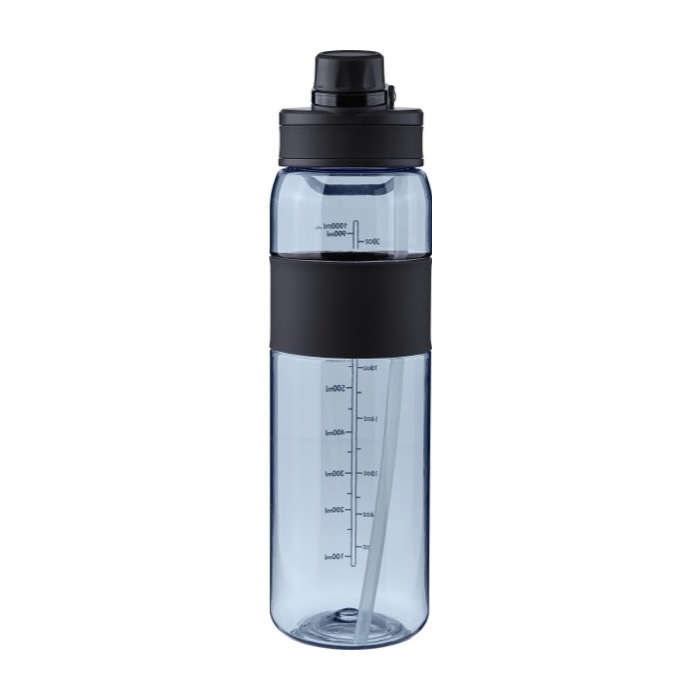 Trinkflasche aus Tritan (900 ml) mit zwei Trinkoptionen: Drehverschluss und klappbarer Strohhalm mit Innenrohr. Mit Schraubdeckel, Silikongriff, Tragegriff aus PP und Kapazitätsanzeige. Geliefert in Kartonbox