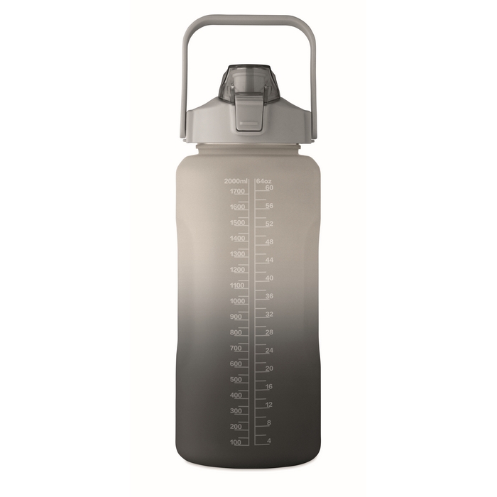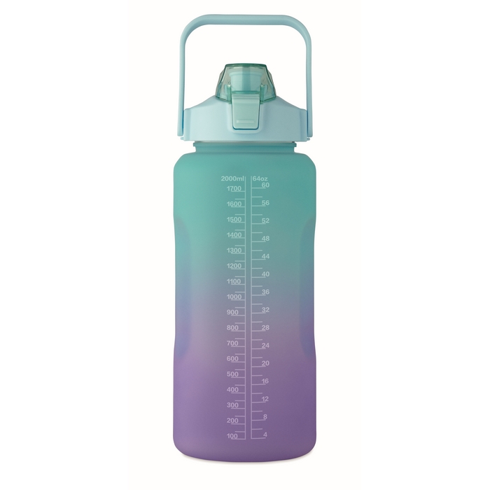 RPET-Trinkflasche mit einem Fassungsvermögen von 2 L, konzipiert für lange Tage. Sie verfügt über einen Klappdeckel, der sich mit einer Hand öffnen lässt, einen integrierten Strohhalm und eine Sicherheitsverriegelung, um unbeabsichtigtes Öffnen zu verhindern. Das auslaufsichere Design erleichtert den Transport im Rucksack oder in der Aktentasche ohne Sorgen, und der Griff sorgt für bequemes Halten und Tragen. Praktische Option für interne Ausstattung, Willkommenssets oder Kampagnen zu gesunden Gewohnheiten im Unternehmen.