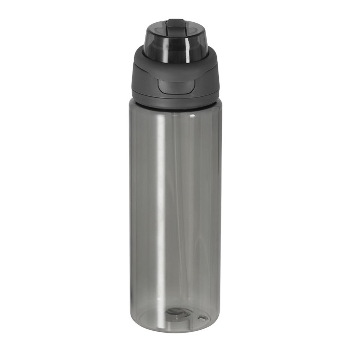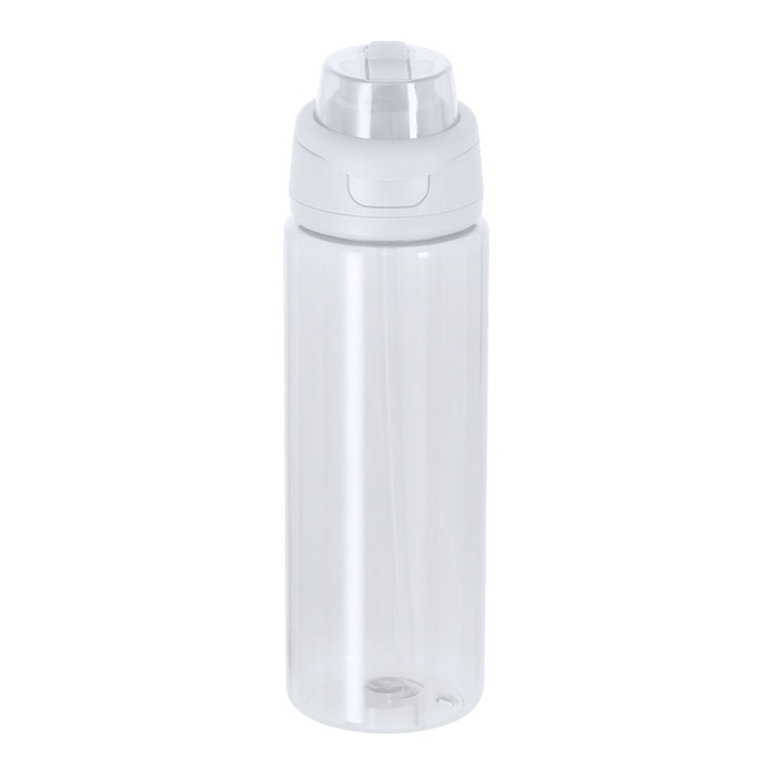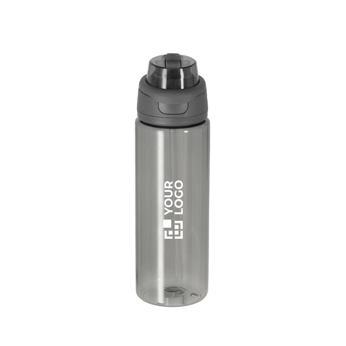 Flasche aus recyceltem Kunststoff mit transluzenter Oberfläche und 750 ml Fassungsvermögen, entwickelt für den täglichen Einsatz im Büro und unterwegs. Sie verfügt über ein doppeltes Trinksystem: Strohhalm für bequemes Trinken und eine Direktöffnung für schnelles Trinken. Der Deckel mit Push-Verschluss hilft, unbeabsichtigtes Öffnen zu vermeiden, und der klappbare Tragegriff erleichtert den Transport oder das Befestigen an Rucksäcken. Hergestellt ohne BPA (Bisphenol A) für eine sicherere Nutzung. Eine praktische Option für HR-Maßnahmen, Messen oder Kampagnen mit Logo.