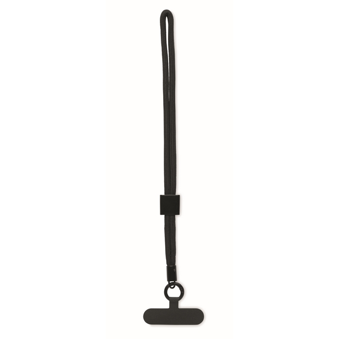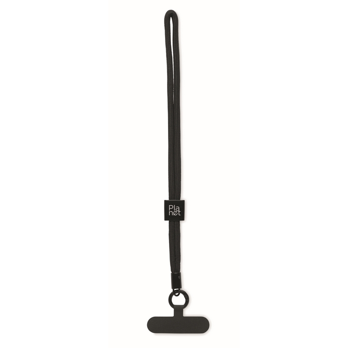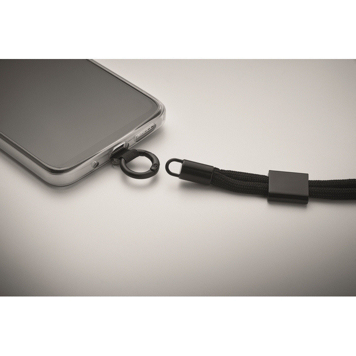 Verstellbare Handykette für das Handgelenk aus RPET-Polyester mit Universalhalter. Länge 25 cm.