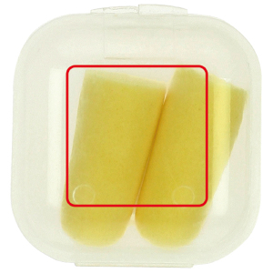 Zwei weiche Ohrstöpsel, verpackt in einer transparenter Schachtel. Kann mit einem Tampondruck auf der Schachtel oder einem Digitaldruck bis hin zur Vollfarbe bedruckt werden.