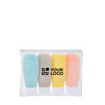 Reiseetui mit PVC-Flaschen. Enthält 4 Flaschen mit 60 ml Kapazität, in verschiedenen Farben (rosa, hellblau, gelb und grau) und weichem gummiartigem Finish, ideal, um Flüssigkeiten und persönliche Pflegeprodukte zu organisieren. Präsentiert in einer transparenten PVC-Tasche mit wasserdichtem Reißverschluss.