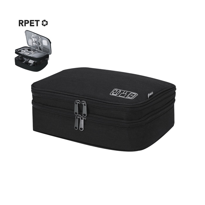 Grosse Organizer-Tasche aus recyceltem Kunststoff (RPET) 600D, entwickelt, um Büromaterial, Kabel oder Zubehör ordentlich aufzubewahren. Sie verfügt über 3 Fächer mit vollständiger Öffnung und Doppel-Metallzipper, damit Sie schnell auf den Inhalt zugreifen können. Im Inneren befinden sich mehrere Unterteilungen in unterschiedlichen Formaten, die helfen, kleine Teile und Dokumente zu trennen. Mit Tragegriff für einen komfortablen Transport zwischen Meetings, Besuchen oder Messen. Eine praktische Option für Werbeaktionen und Unternehmensübergaben mit Logo.