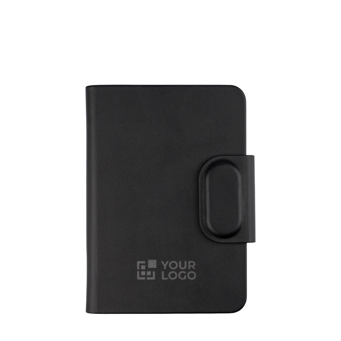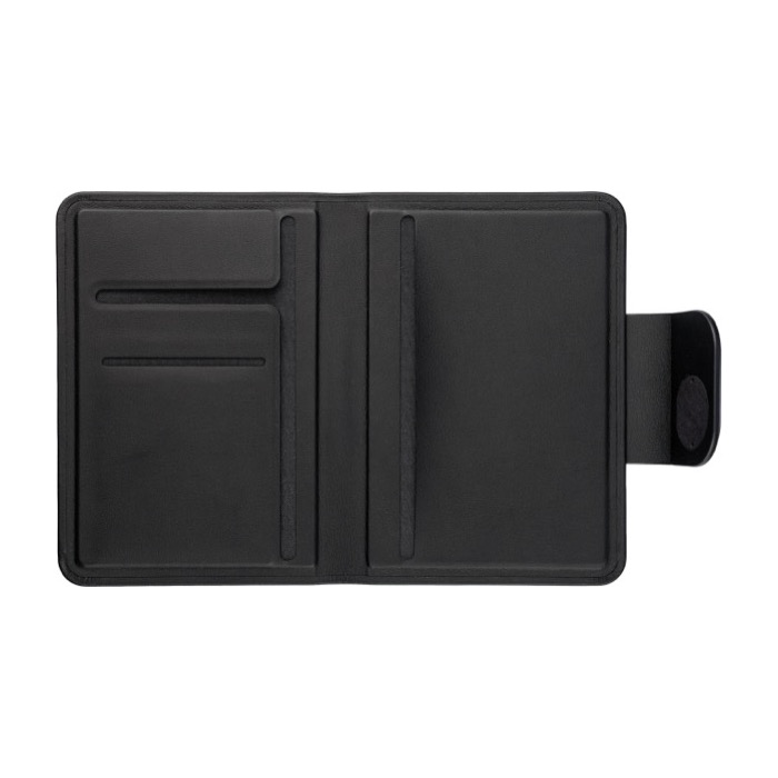 Reisepasshülle aus recyceltem PU mit Magnetverschluss und Apple FindMy-Tracker. Organisiert und schützt Dokumente unter deinem Unternehmenslogo.