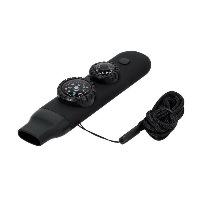 Überlebenspfeife aus Kunststoff mit gummierter Oberfläche, damit Sie sie bei Ausflügen und Outdoor-Aktivitäten stets griffbereit haben. Sie vereint Kompass, Hochleistungspfeife, Thermometer von -20ºC bis 50ºC, Lupe, Spiegel sowie eine Taschenlampe mit 2 LEDs und Ein-/Aus-Schalter. Inklusive Band zum Umhängen, damit Sie sie bequem transportieren können. Praktische Option für Unternehmensmaßnahmen mit Bezug zu Sicherheit, Outdoor-Events oder internen Schulungen.
