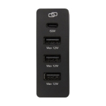 Ladestation für internationale Umgebungen, ausgestattet mit Kabeln, die mit Steckern der Europäischen Union und des Vereinigten Königreichs kompatibel sind (100–240 V AC, 50/60 Hz). Sie verfügt über drei USB-A-Anschlüsse und einen USB-C-Anschluss, die das gleichzeitige Laden mehrerer Geräte mit hoher Geschwindigkeit ermöglichen. Der USB-C-Anschluss bietet variable Ausgangsspannungen von bis zu 60 W und passt sich verschiedenen Ladeanforderungen an, während die USB-A-Anschlüsse jeweils eine konstante Ausgangsleistung von 5 V / 2,4 A bereitstellen.