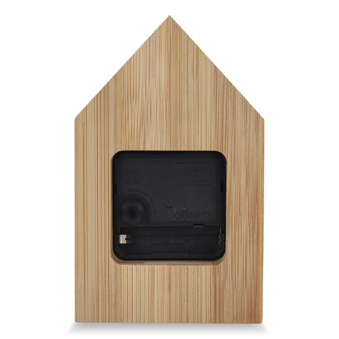 Uhr in Hausform mit Bambusfinish, die dem Arbeitsplatz Persönlichkeit verleiht und Zeit im Blick hält. Ideal zur Betonung nachhaltiger Markenwerte.